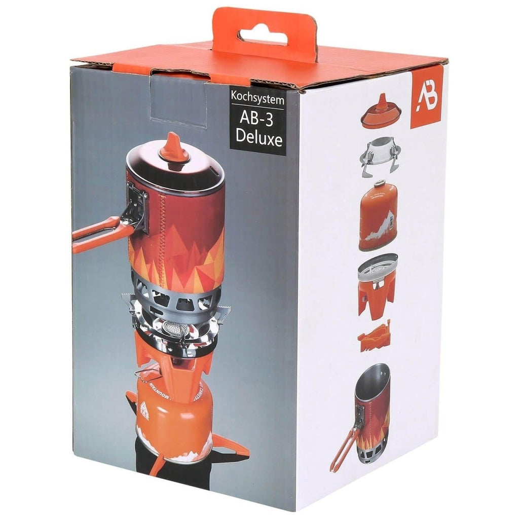Cocina de gas compacta con un diseño innovador. El AB-3 Deluxe consta de una olla de 0,8 litros con funda de neopreno (aísla los alimentos y protege contra quemaduras). Aletas calefactoras y adaptador para la resistencia del quemador. La construcción con protección contra el viento e intercambiadores de calor permite aprox. Un 40% menos de consumo de combustible que una simple cocina de gas. incluido portacartuchos. La cocina puede funcionar con todos los cartuchos de gas de rosca disponibles en el mercado.