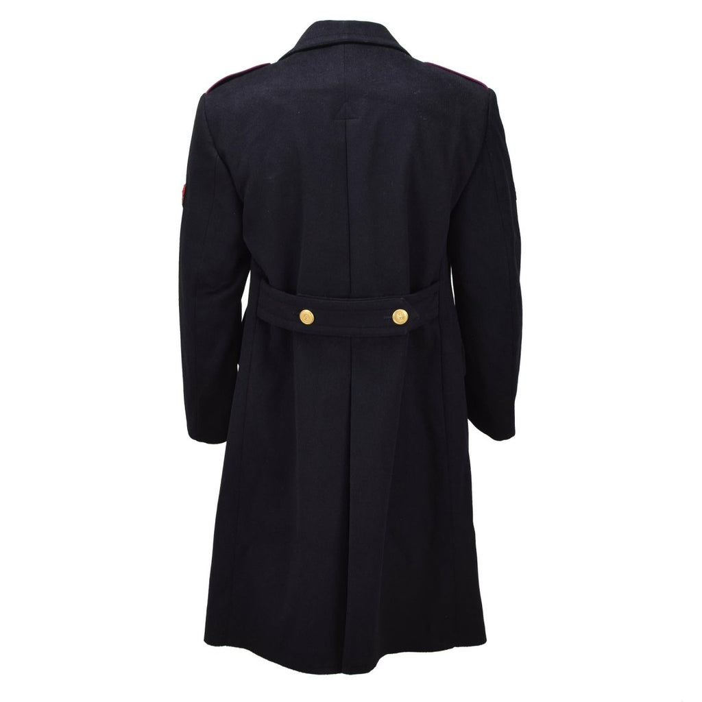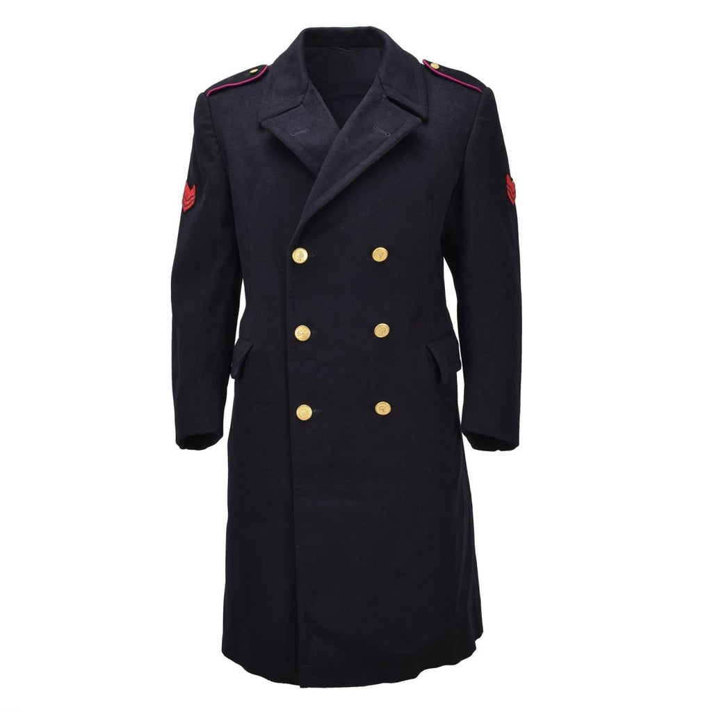 Confeccionado con un tejido de lana de calidad, el abrigo proporciona calidez y estructura, lo que lo hace adecuado para las estaciones más frías. El frente cruzado con botones metálicos decorativos añade un aspecto refinado y oficial, mientras que el corte largo realza su silueta formal. Los detalles en los hombros y los detalles de las insignias enfatizan aún más su carácter ceremonial.