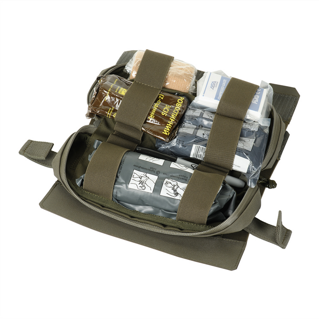 La bolsa consta de una funda exterior y un inserto IFAK extraíble. El inserto se puede quitar rápidamente tirando de la correa, lo que permite un acceso rápido a los suministros médicos. En el interior hay un sistema organizador elástico para asegurar el equipo de primeros auxilios (material médico no incluido).