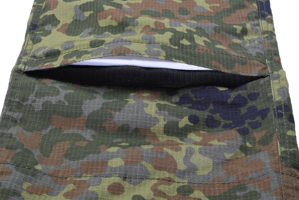 - Confeccionados con material ripstop de alta calidad, estos pantalones cargo flecktarn resisten desgarros y resisten el uso intensivo. El asiento y las rodillas reforzados añaden durabilidad adicional, lo que los hace ideales para gatear, arrodillarse o realizar actividades intensas. El patrón de camuflaje flecktarn combina a la perfección con el entorno natural, proporcionando una ocultación eficaz en zonas boscosas.