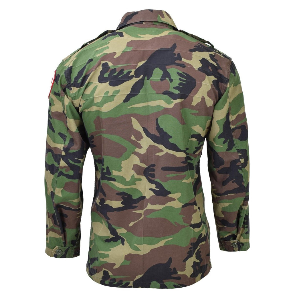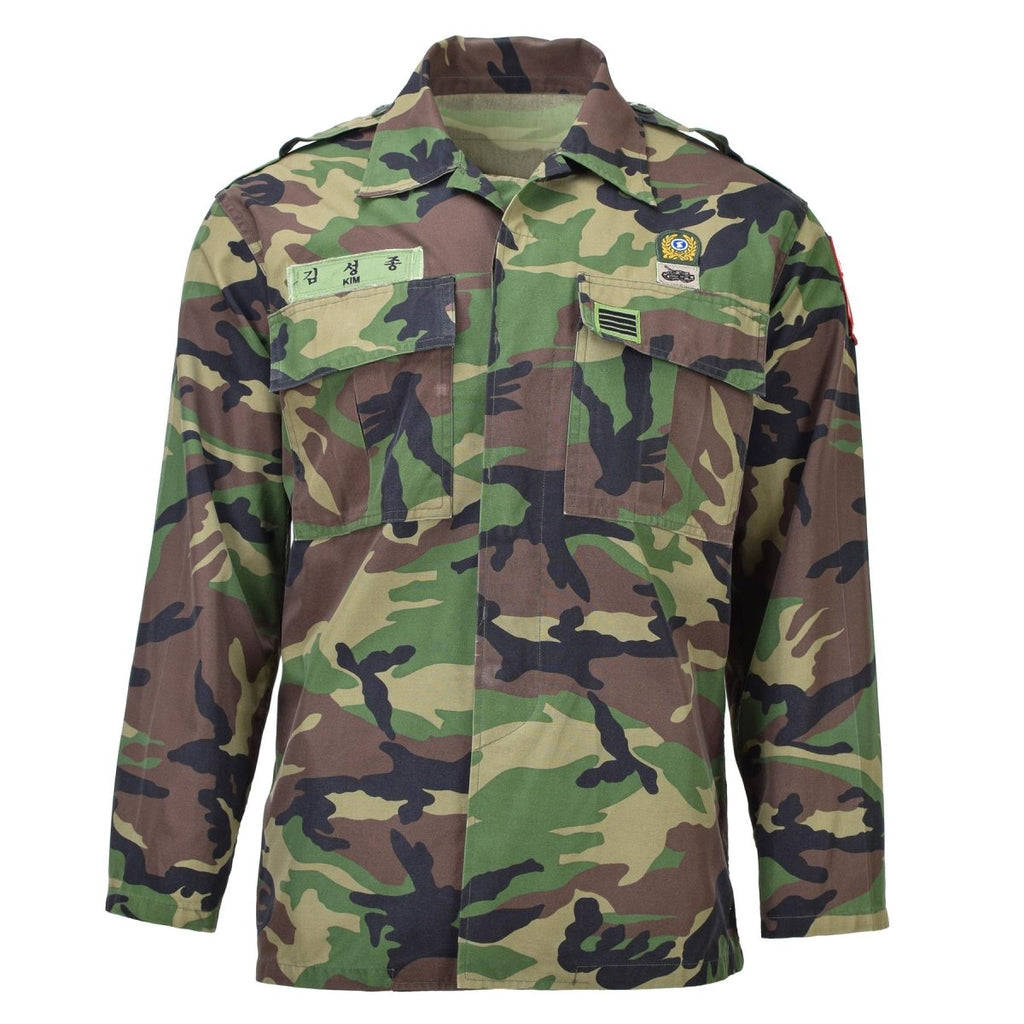 Las camisas del ejército de Corea que se muestran son prendas de algodón duraderas que presentan un patrón distintivo en verde y negro para una ocultación eficaz en exteriores. Específicamente, es la variante de campo de combate de camuflaje forestal M90 de la camiseta táctica militar original de Corea del Sur.