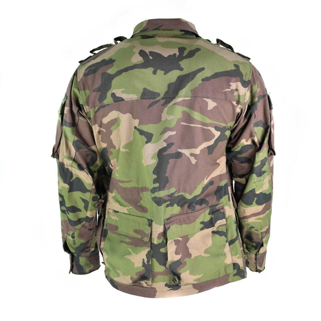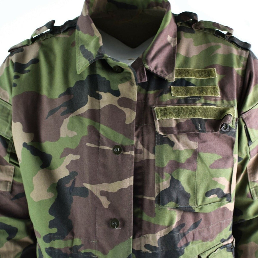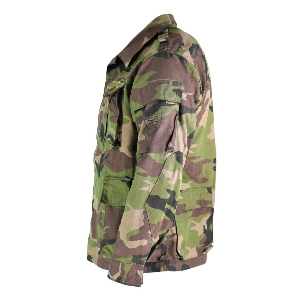La chaqueta de campo militar eslovaca original vintage M97 de camuflaje es una chaqueta que fue utilizada por las Fuerzas Armadas de Eslovaquia a finales de los años 1990. Está hecho de un material duradero y resistente al agua y presenta un patrón de camuflaje diseñado para integrarse en ambientes boscosos.