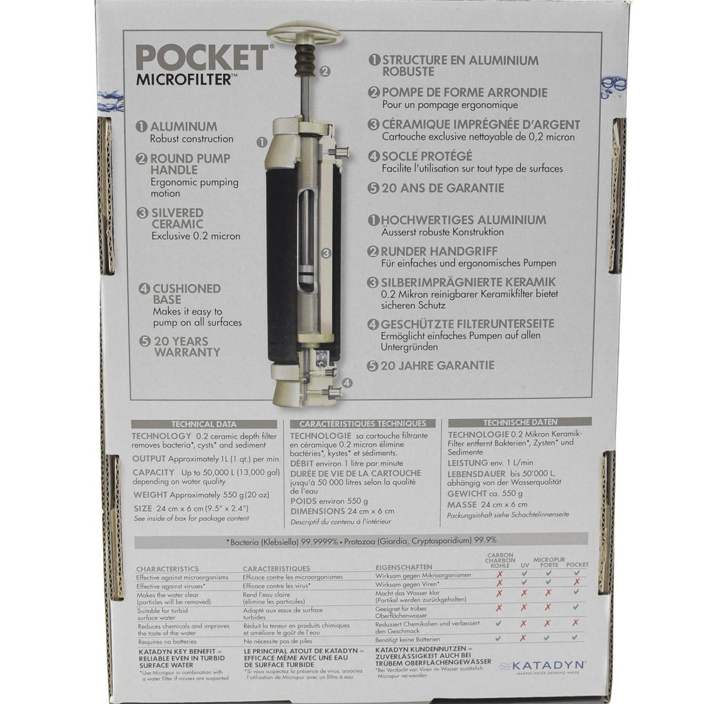 - El microfiltro de bolsillo Katadyn es ideal para grupos pequeños, manejando las necesidades de filtración de agua para 1-4 personas en caminatas o expediciones extendidas. Está diseñado para durar, con una capacidad de hasta 50,000 litros, dependiendo de la calidad del agua. El filtro de cerámica impregnado de plata elimina las bacterias dañinas, los protozoos y otros agentes que causan enfermedades. Asegurando que se mantenga seguro durante su viaje.