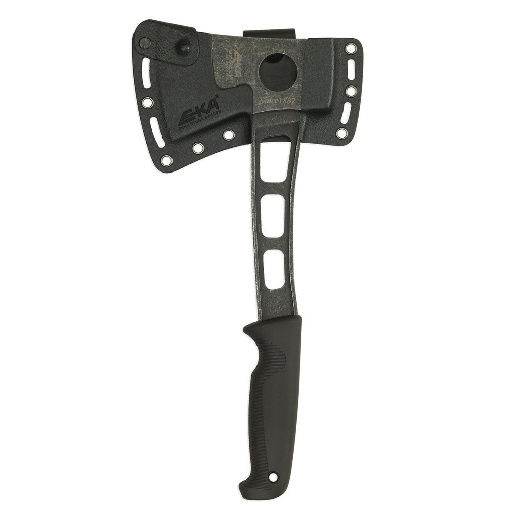 El HatchBlade W1 de EKA es el tamaño compacto perfecto alrededor del hacha al aire libre. Medición de 12.6 pulgadas, es fácil empacar y llevar consigo prácticamente a cualquier lugar para cualquier situación. Tiene un buen mango ergonómicamente formado que se siente cómodo en la mano y ayuda al usuario a lograr la máxima potencia e impacto al dividir o cortar madera. También hay una abertura de 1 pulgada de diámetro en la cabeza que permitiría al usuario colocar un dedo para un mayor control y agarre cuando se usa para una tarea más fina, como hacer una estaca de tienda, una cola, una paleta de plumas o incluso para la preparación de alimentos. El HatchBlade W1 de Hatchet Outdoor W1 viene con una vaina Kydex que tiene un clip para cinturón y 11 puntos de azotes para que se pueda unir a casi cualquier cosa.