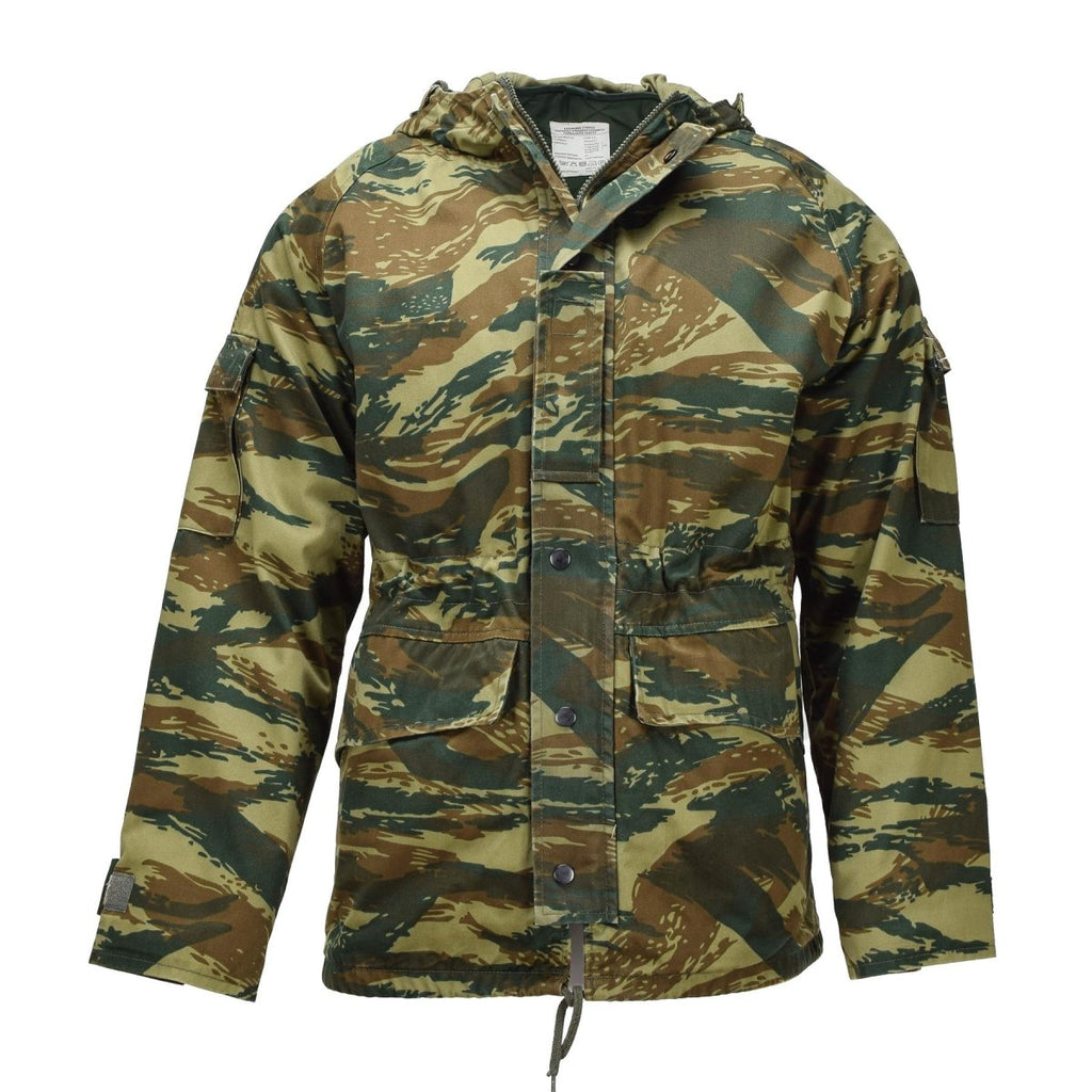 La chaqueta presenta un corte clásico de parka de campo M65 y viene con un forro extraíble, lo que permite un uso adaptable en diferentes condiciones climáticas. Una capucha integrada proporciona protección adicional contra el viento y las temperaturas más frías. El distintivo patrón de camuflaje del lagarto griego le da a la chaqueta su auténtico aspecto militar.