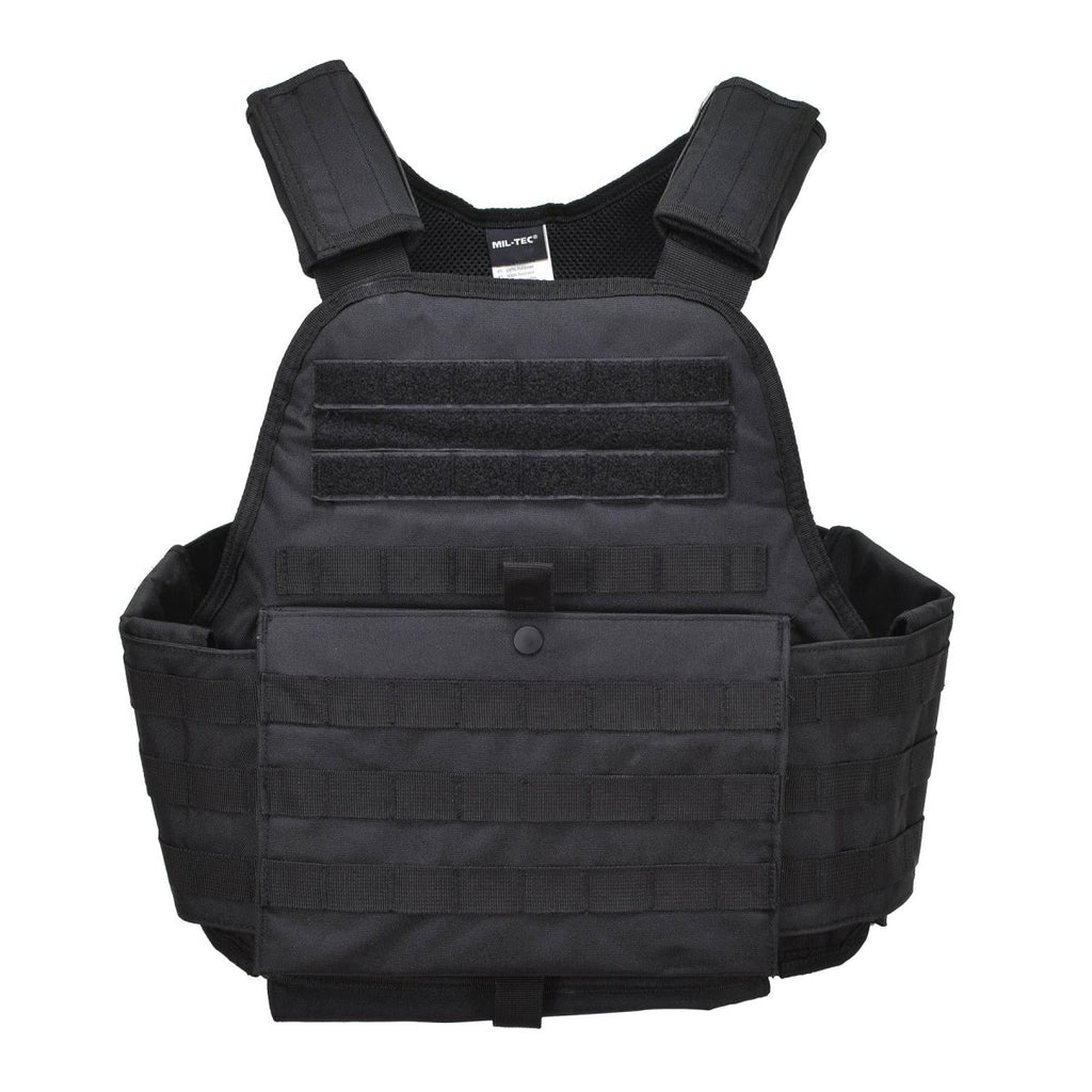 - Además, su forro de poliéster y su relleno de espuma de polietileno mejoran la comodidad sin comprometer la protección. En sus compartimentos para placas de aproximadamente 27 x 33 cm se pueden alojar diferentes placas balísticas.